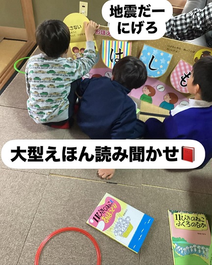 人間関係・社会性 大型えほん「地震だーにげろ!」 2025-05-282025-05-28 投稿者 : スタッフ 01 防災士さんが大型えほんを寄付してくれました 『じしんだー。にげろ!』 地震がおきたら、まずどうする? えほんのお話しを聞いて自分たちにできることをお友達と話しました スタッフ 01