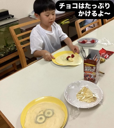 健康・生活 チョコバナナ・いちごクレープ 2025-06-102025-06-11 投稿者 : スタッフ 01 クッキング チョコバナナ🍌クレープいちご🍓もあるよ 『おかわり!』の声や「⭐︎⭐︎⭐︎⭐︎⭐︎星5個だね」のつぶやきで みんなで笑顔になりました スタッフ 01