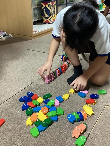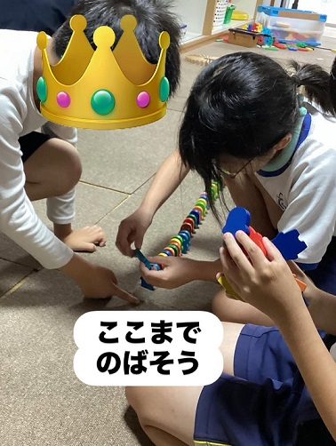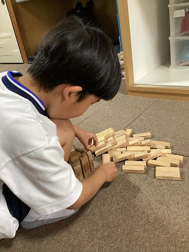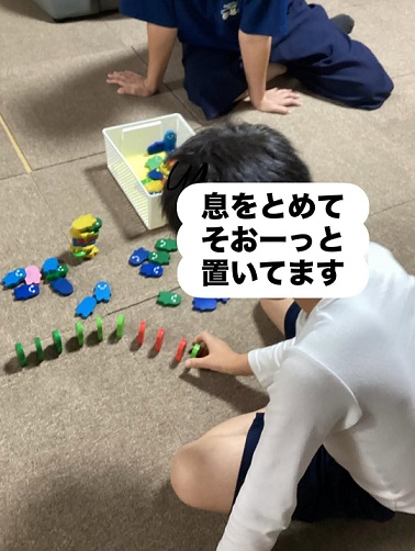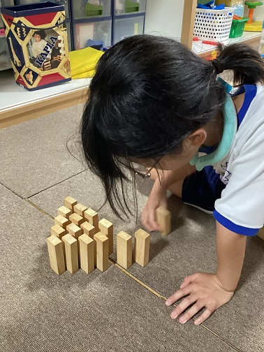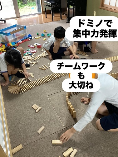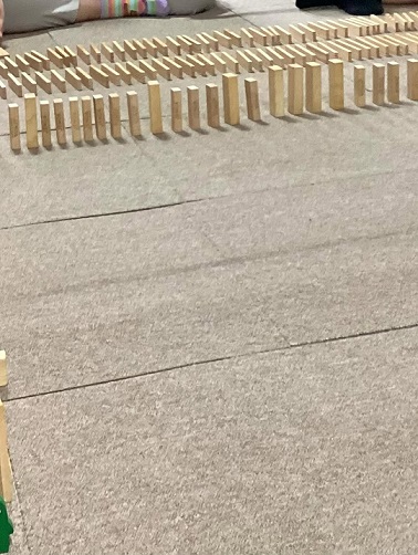 ひとつずつみんなで協力して長いドミノ作ったよ👍